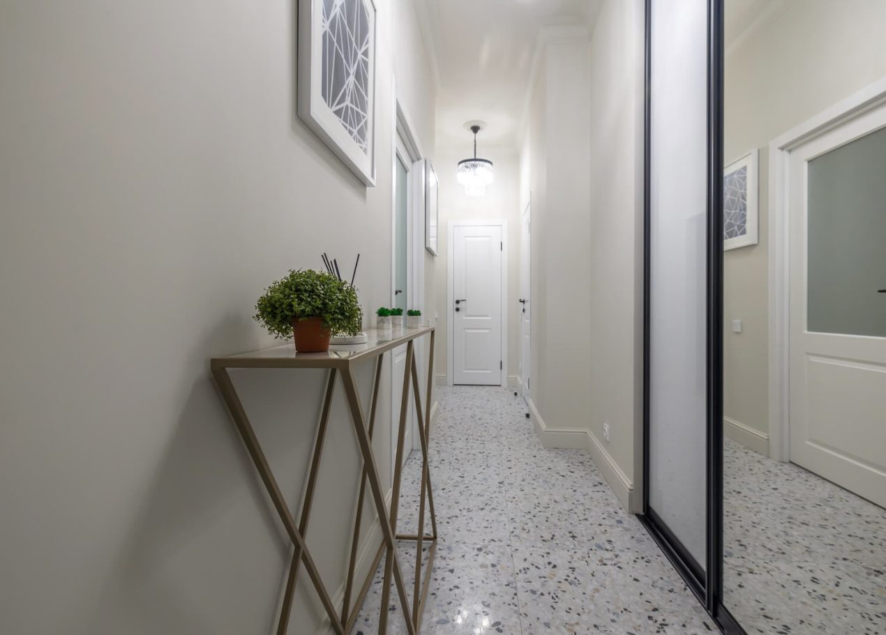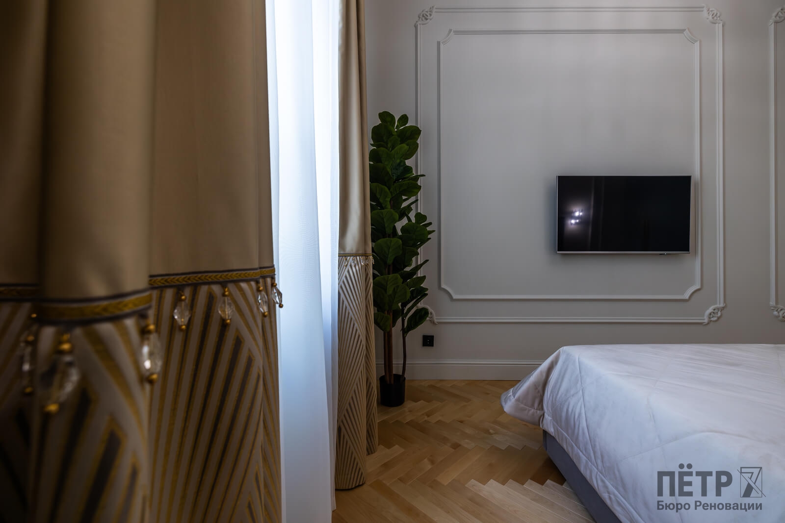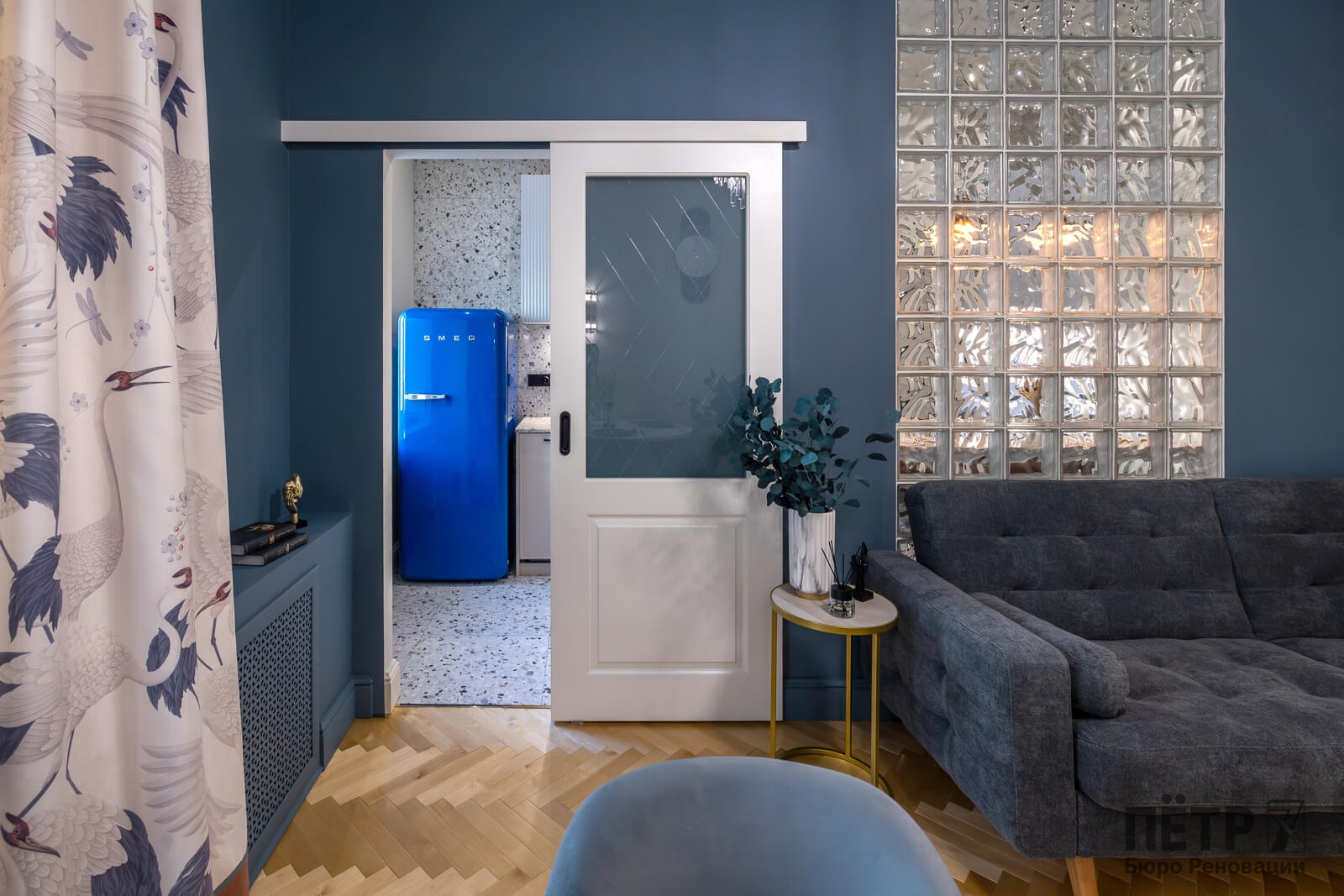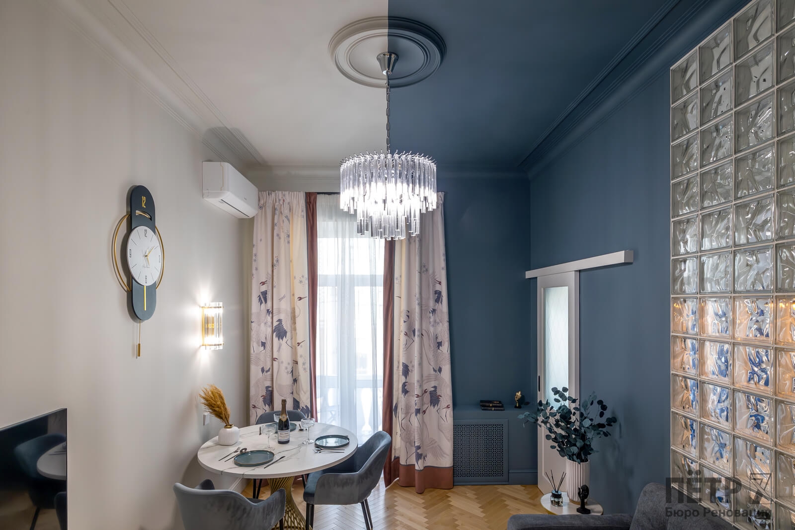 В интерьере сохранили характерные элементы исторического жилья: потолки около 3,4 метра, паркет «ёлочкой», спокойную архитектуру стен и аккуратные интерьерные акценты. Все инженерные системы были полностью обновлены, что позволило совместить архитектуру старого фонда с современным уровнем комфорта.