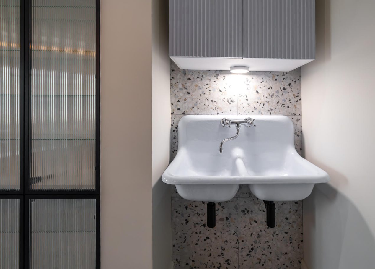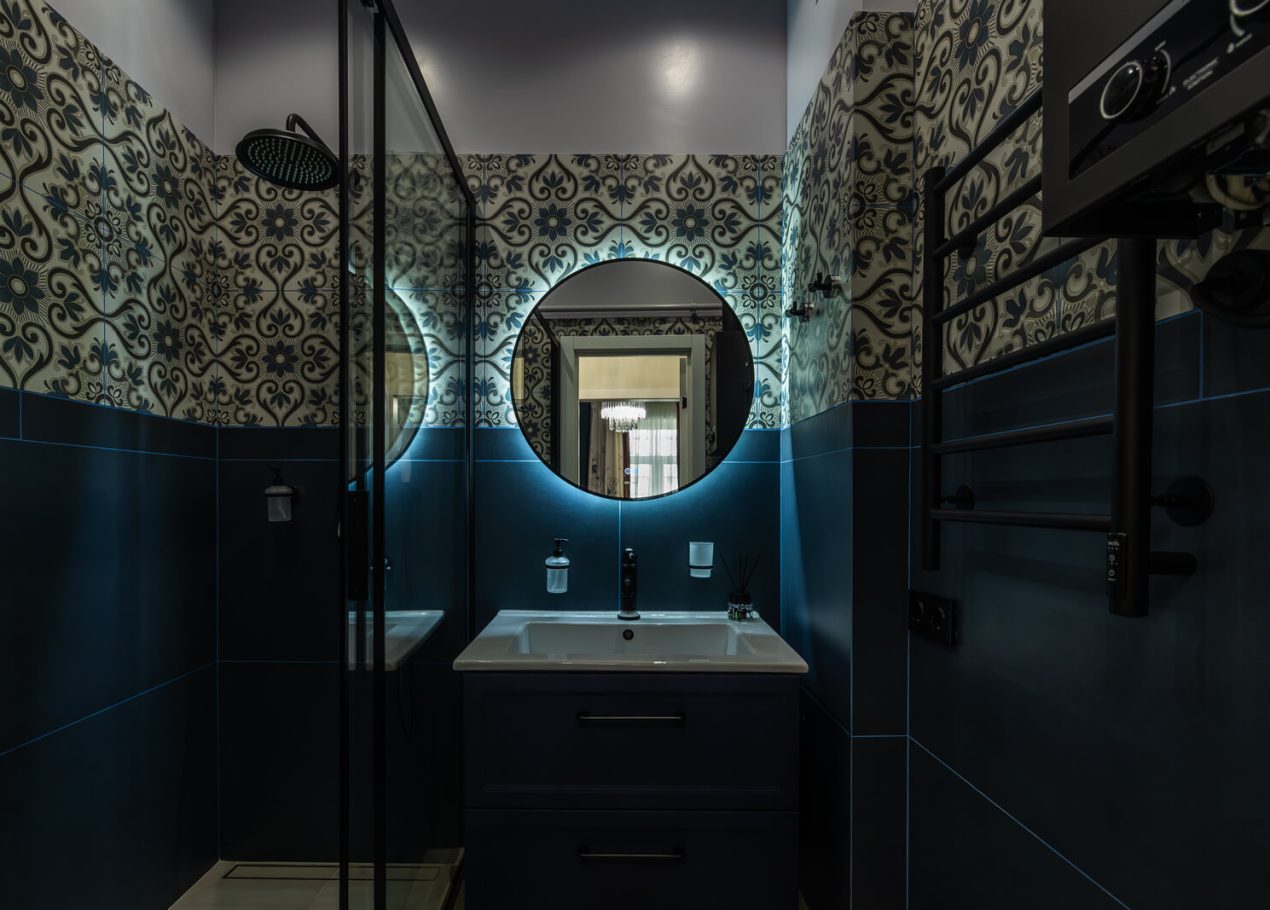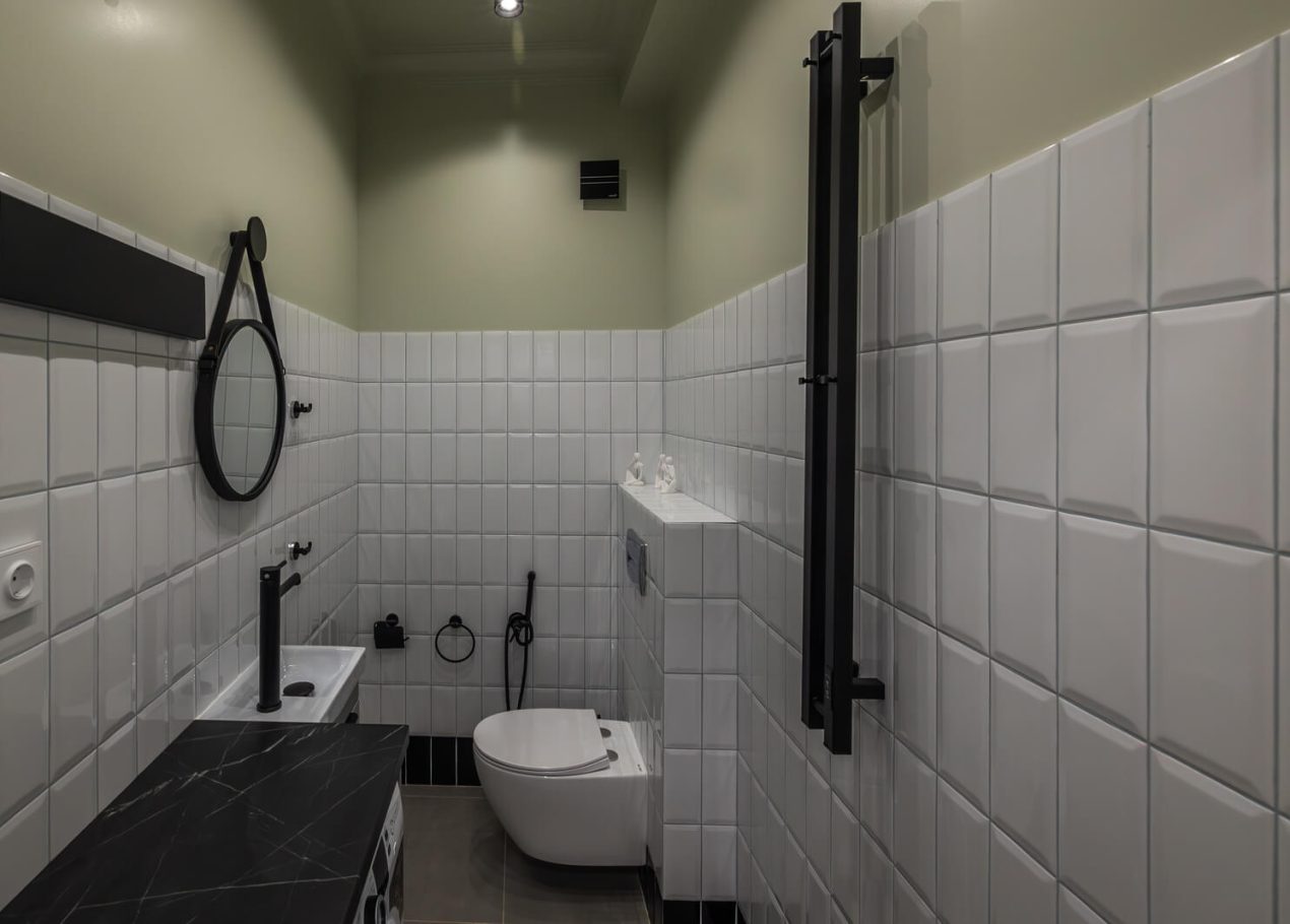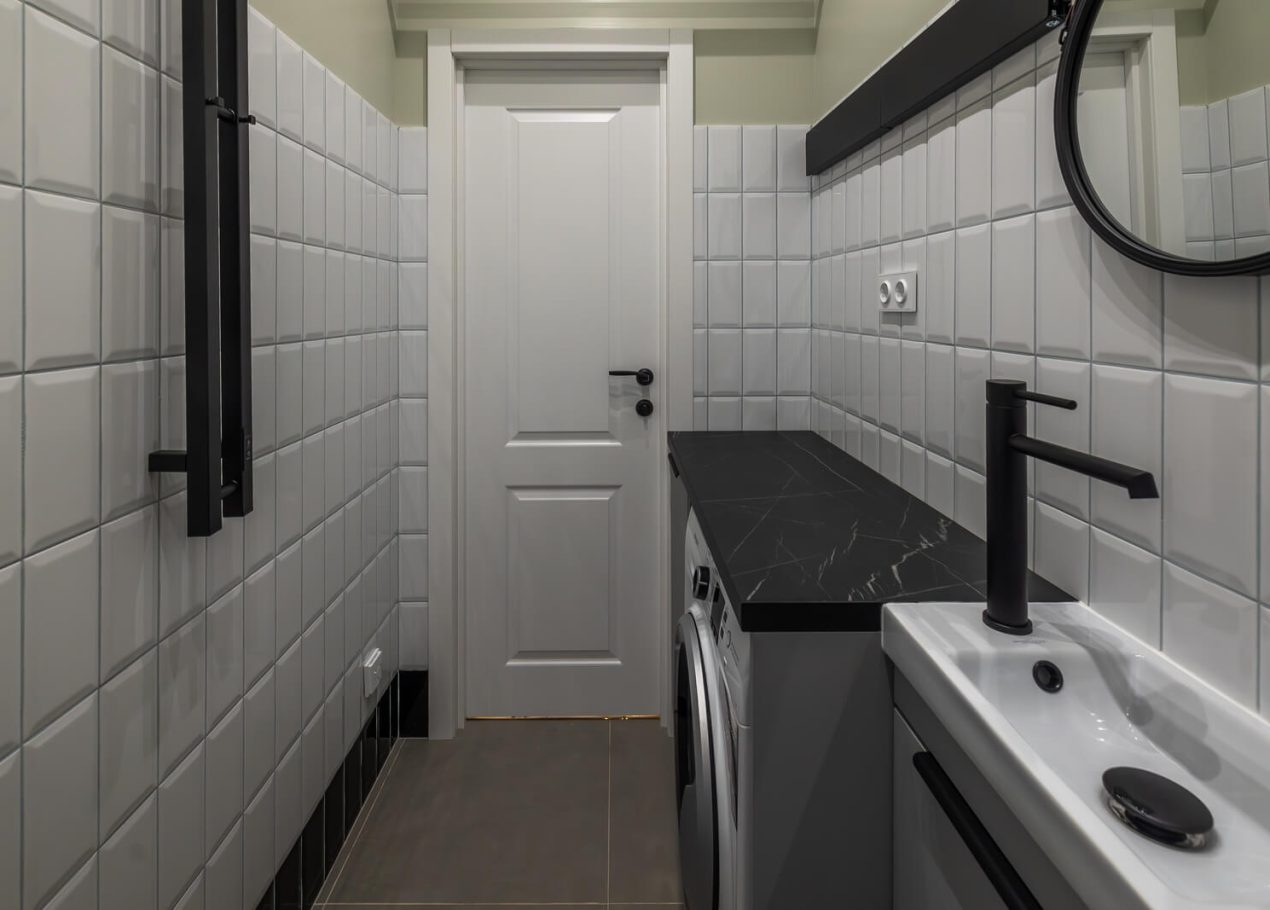 Основной задачей реновации было обновить квартиру, сохранив атмосферу сталинской архитектуры. Пространство перепланировали под современный формат: кухня-гостиная, отдельная спальня и раздельные санузлы. В одном из санузлов разместили компактную прачечную зону.
