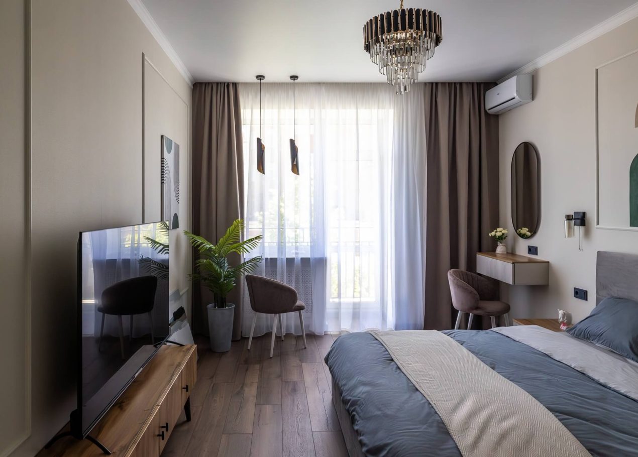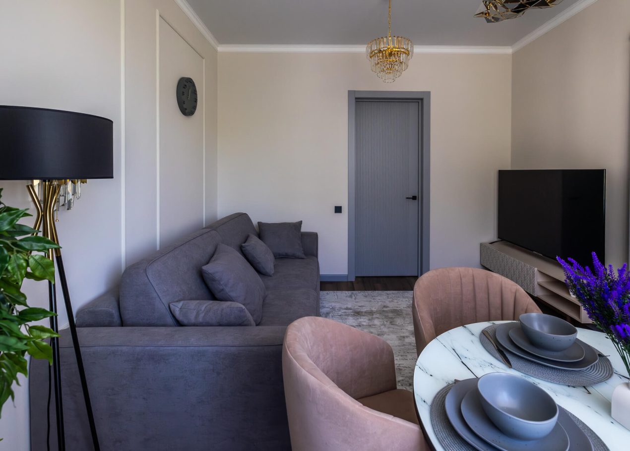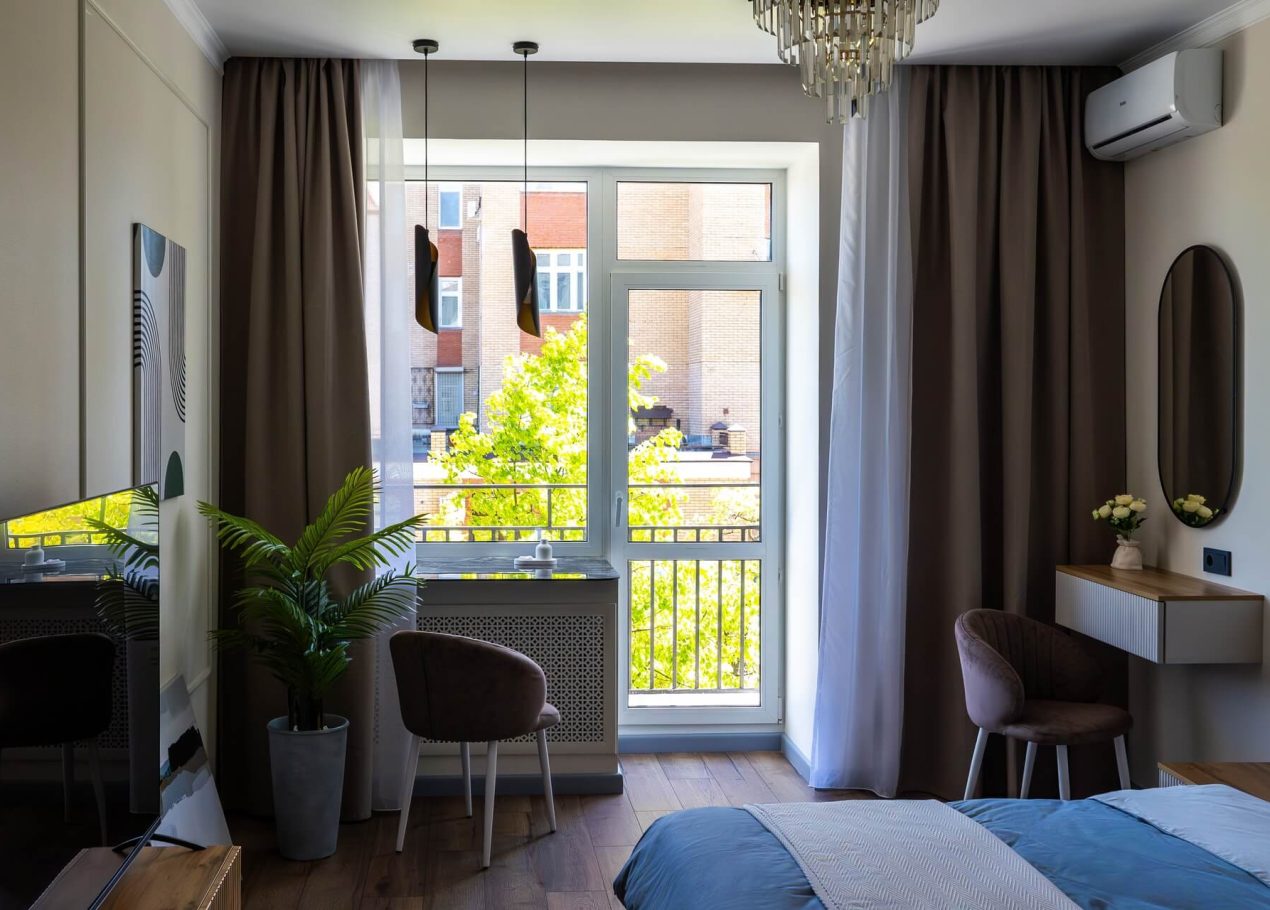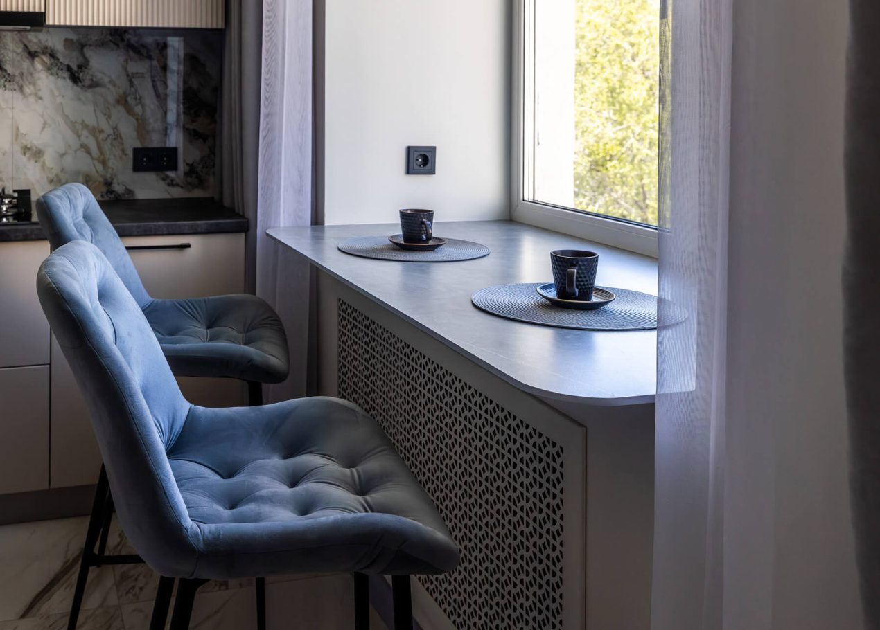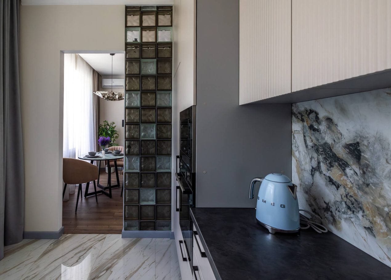 Планировку адаптировали под современный формат жизни: кухня-гостиная, отдельная спальня, раздельные санузлы и просторный холл. Дополнительными преимуществами квартиры стали два балкона, высокие потолки и видовые характеристики, которые удалось сохранить и подчеркнуть в обновлённом интерьере.