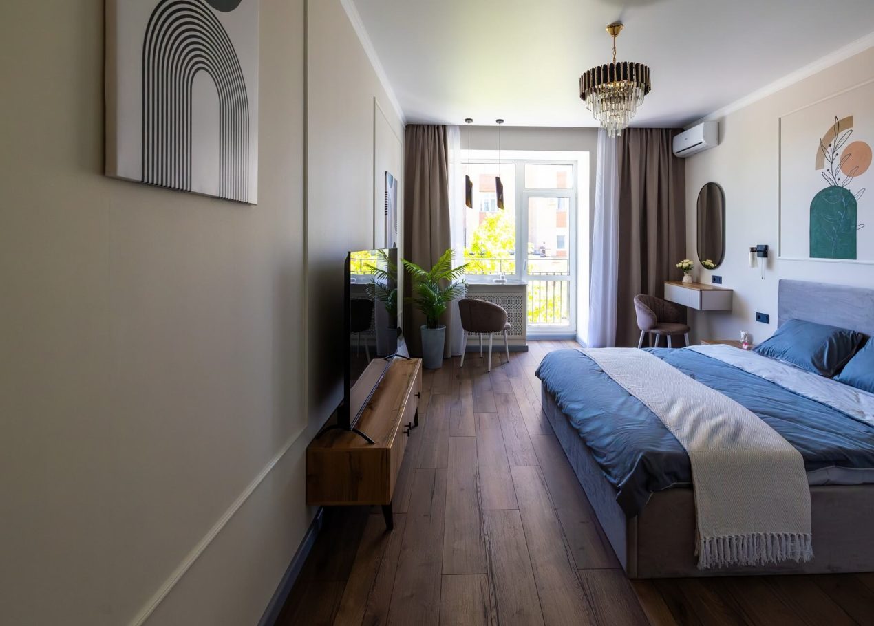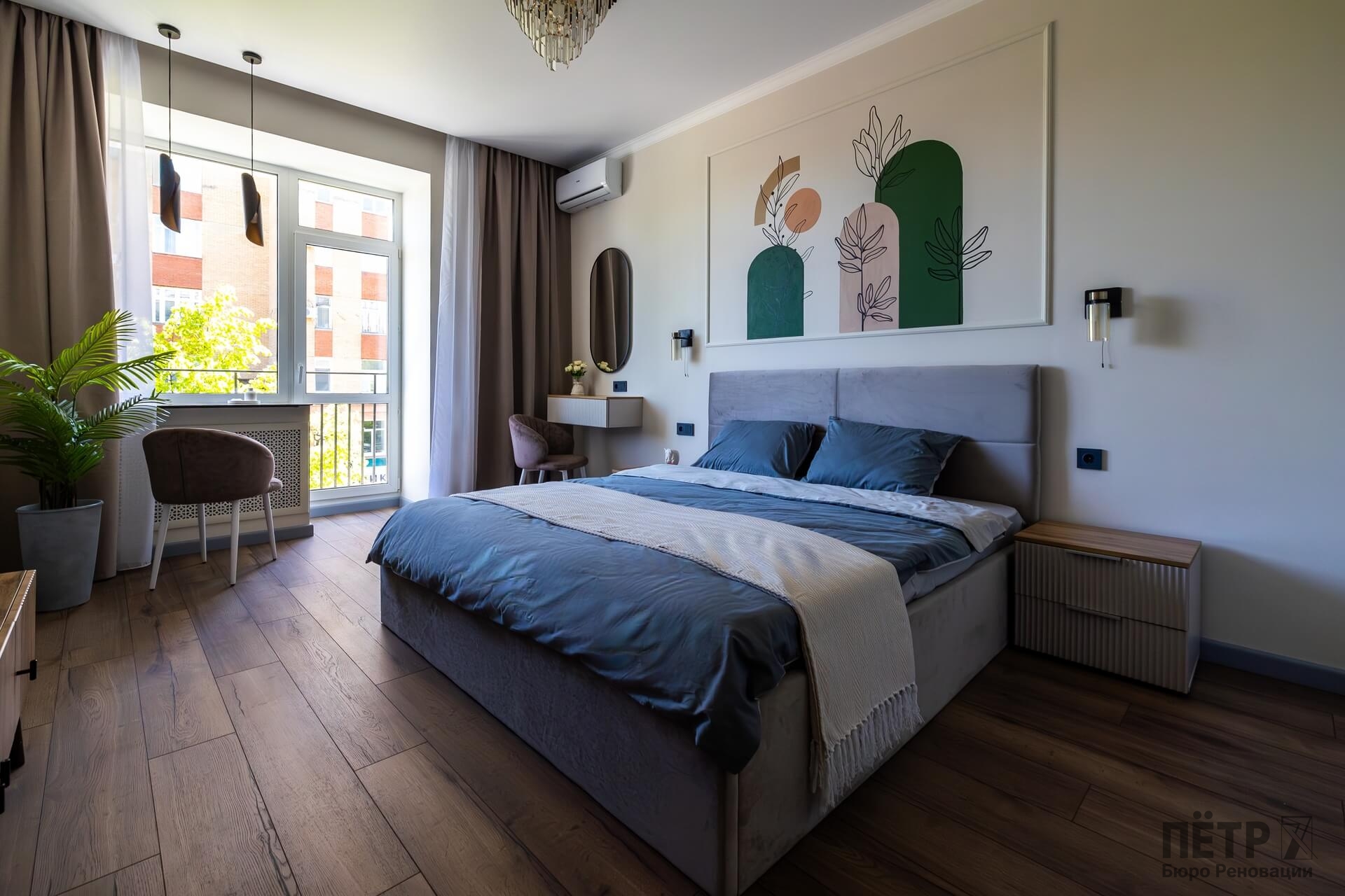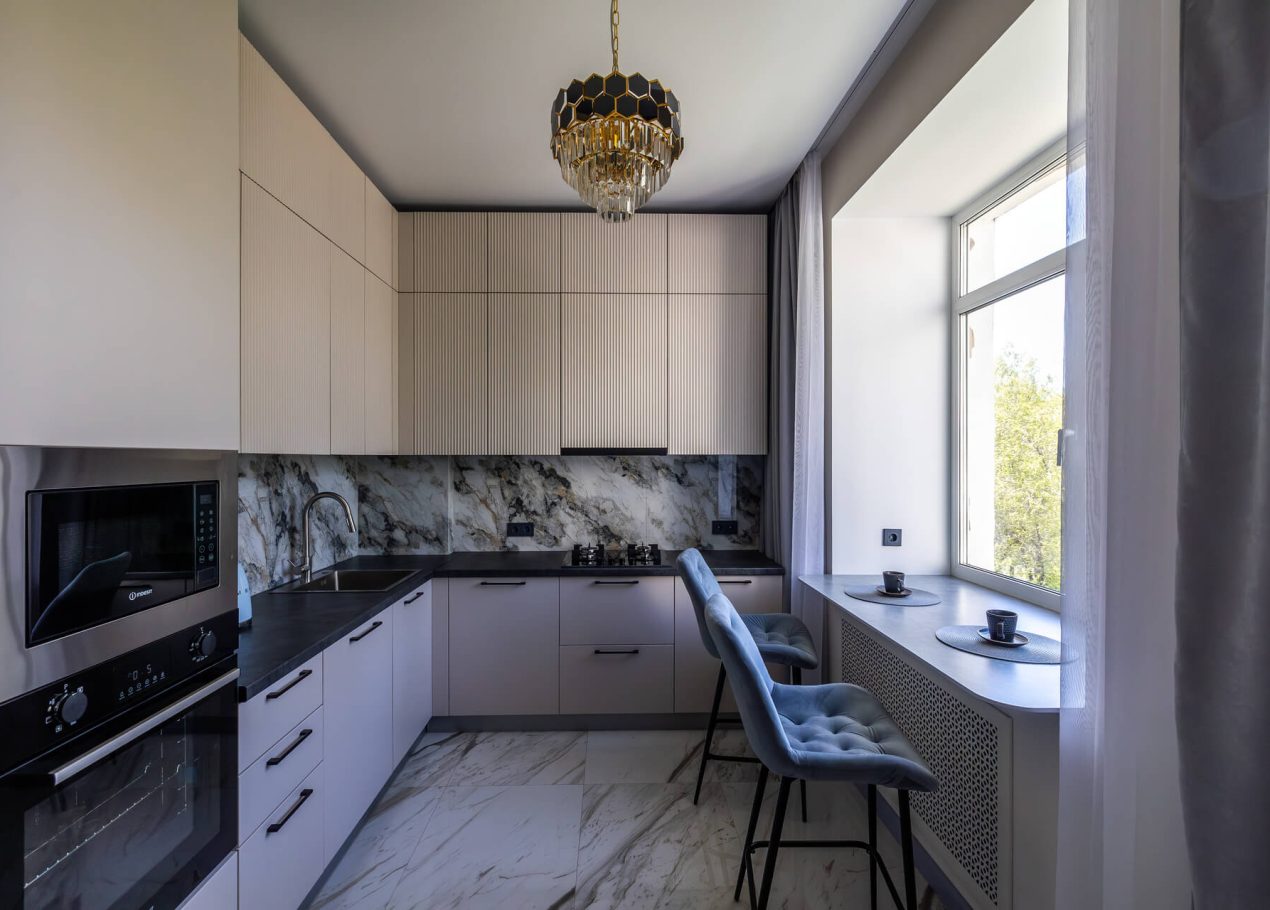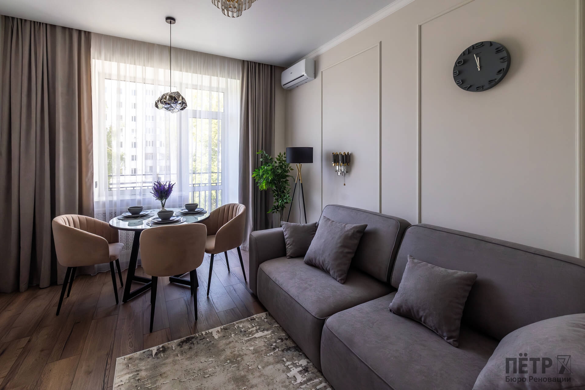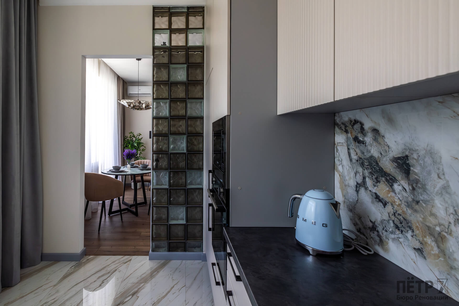 Планировку адаптировали под современный формат жизни: кухня-гостиная, отдельная спальня, раздельные санузлы и просторный холл. Дополнительными преимуществами квартиры стали два балкона, высокие потолки и видовые характеристики, которые удалось сохранить и подчеркнуть в обновлённом интерьере.