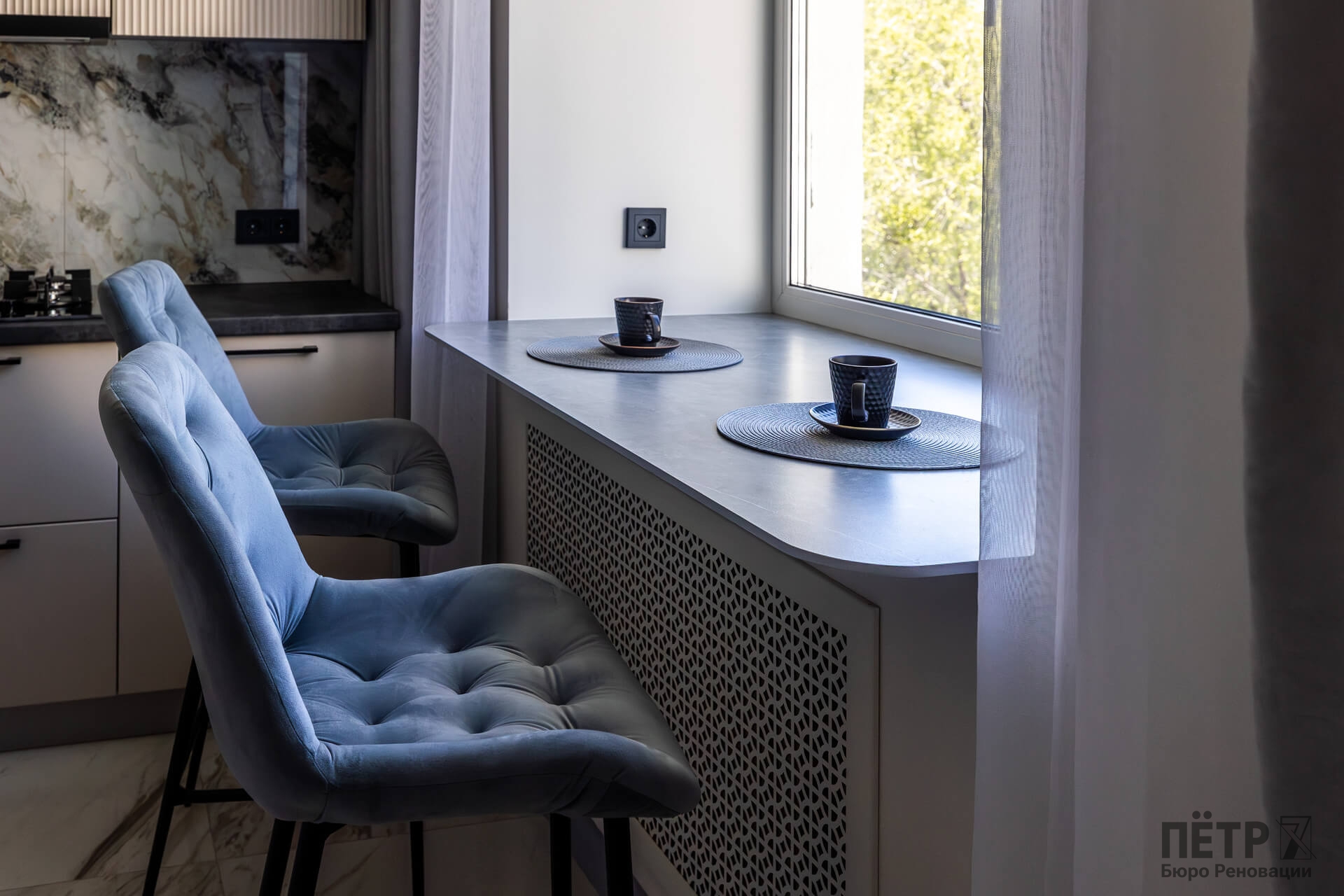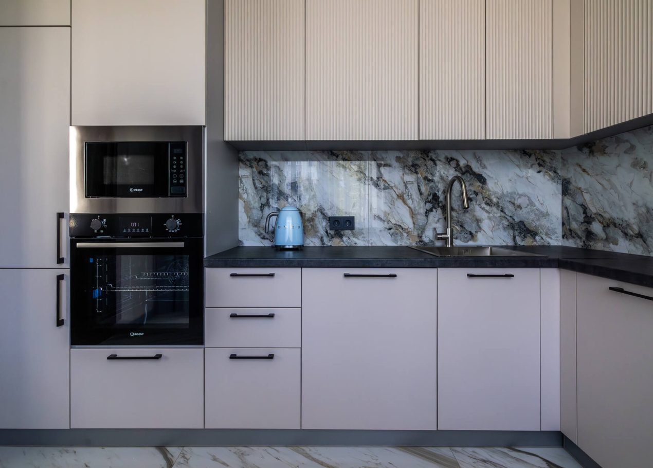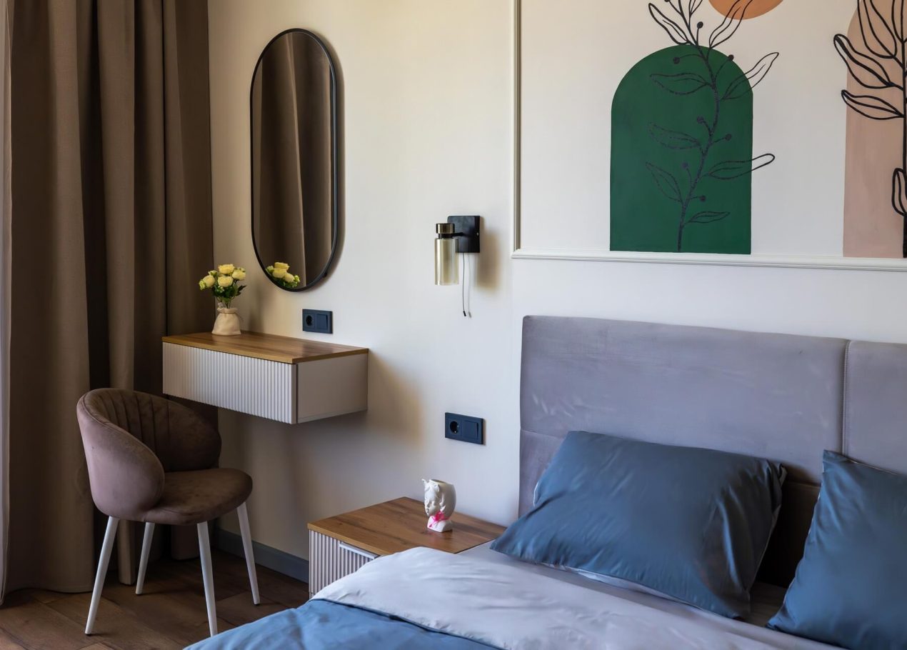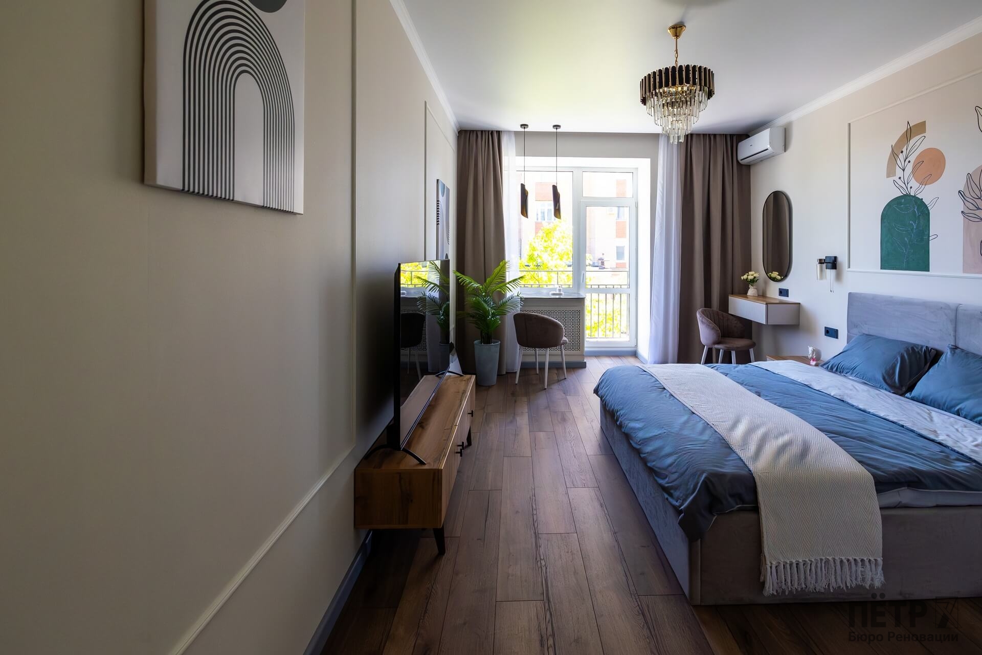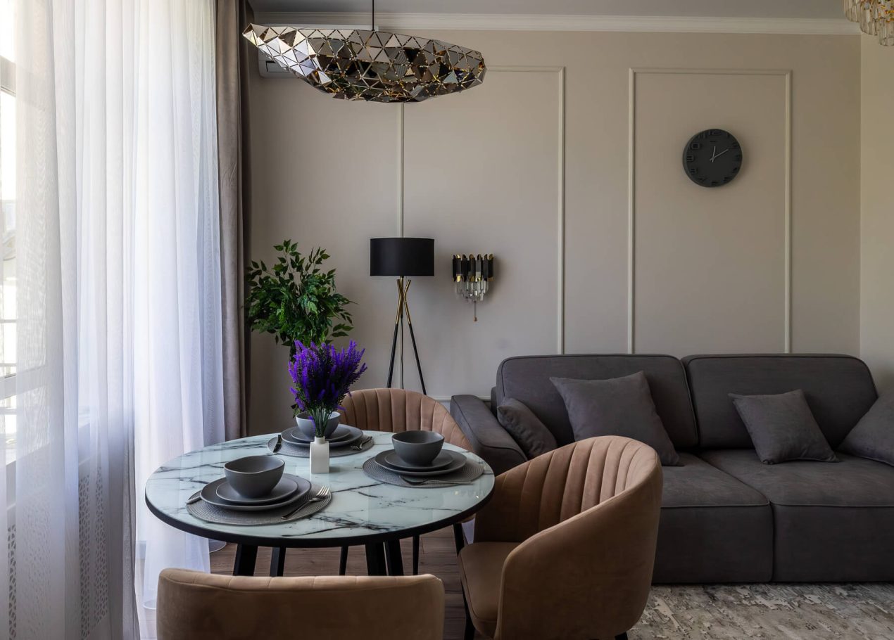 Планировку адаптировали под современный формат жизни: кухня-гостиная, отдельная спальня, раздельные санузлы и просторный холл. Дополнительными преимуществами квартиры стали два балкона, высокие потолки и видовые характеристики, которые удалось сохранить и подчеркнуть в обновлённом интерьере.