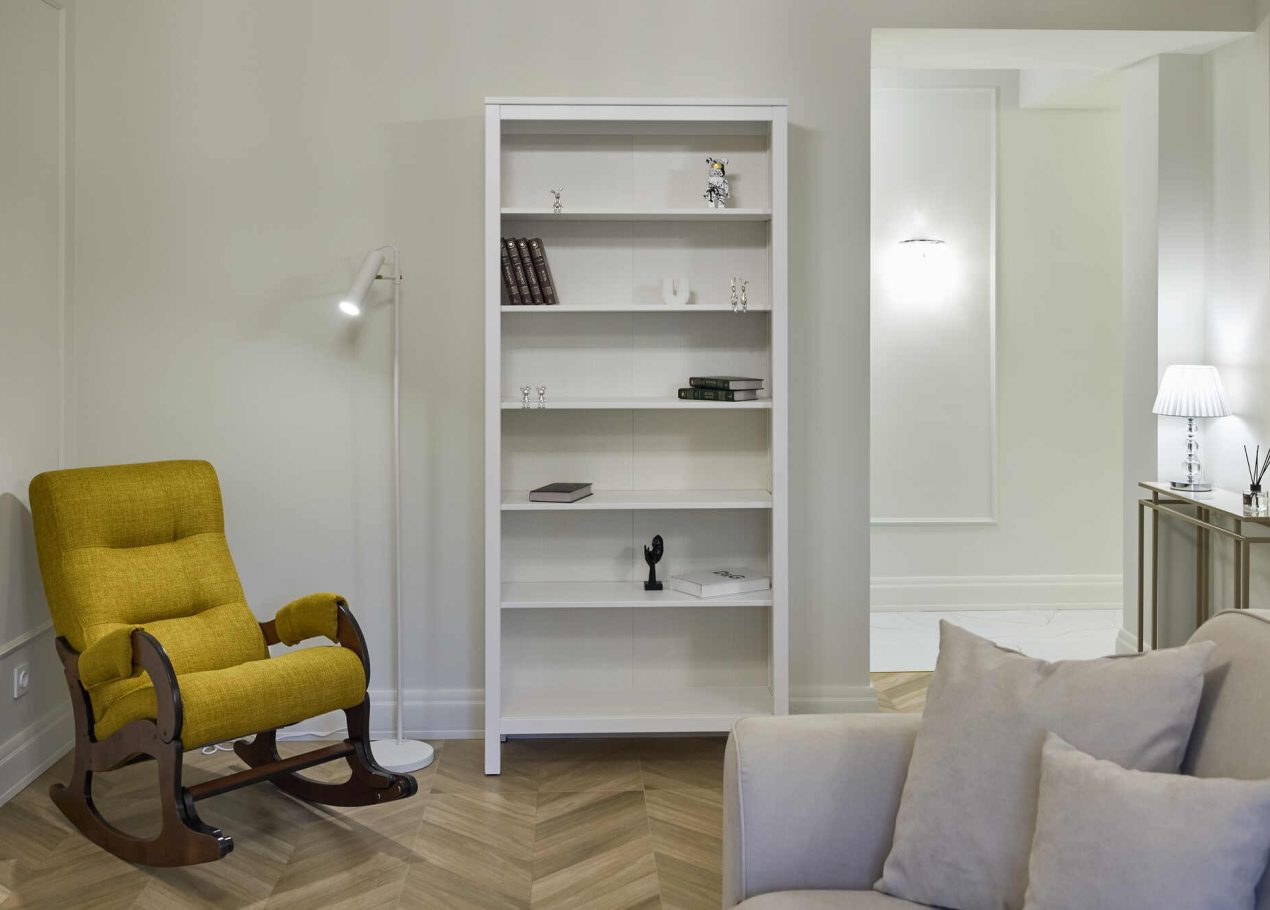 Планировочное решение адаптировали под современную жизнь: кухня-гостиная, мастер-спальня с собственным санузлом, дополнительные зоны хранения и функциональная организация пространства. При этом удалось сохранить характер сталинки — высокие потолки, большие окна и ощущение масштабности помещений.